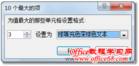 3. 在随即打开的“10个最大的项”对话框中,在“为值最大的那些单元格设置格式”文本框中输入所要选取数据的个数,如“3”,然后,将“设置为”下拉列表框的值设置为“绿填充色深绿色文本”,如3所示。
