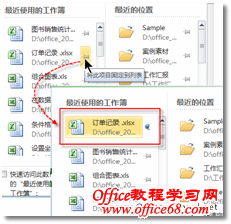 图2 最近所用的文件 3. 在“最近使用的工作簿”区域中找到曾经打开过的“订单记录”工作簿,然后单击其右侧的“图钉”状按钮,即可将其固定在列表中,如图3所示。