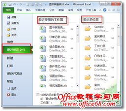 图1 文件选项卡 2. 切换到“最近所用文件”视图中,在该视图中可以看到,在“最近使用的工作簿”及“最近的位置”区域中已经记录了最近使用的Excel工作簿及最近访问的文件夹,如图2所示。
