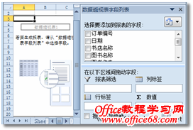 4. 利用右侧的“数据透视表字段列表”任务窗格,可根据需要向当前的数据透视表中添加数据。如,将“选择要添加到报表的字段”区域中的“日期”字段拖至下面的“列标签”区域,将“图书名称”和“销量(本)”字段分别拖至“行标签”和“Σ数值”区域,如4所示。
