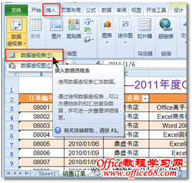 1. 使用Excel 2010打开需要进行分析汇总的订单记录表后,将鼠标定位到数据表格的任意单元格中,然后切换到“插入”选项卡,并在“表格”选项组中单击“数据透视表”下三角按钮,在随即打开的下拉列表中执行【数据透视表】命令,打开“创建数据透视表”对话框,如1所示。