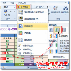 2. 然后在“开始”选项卡的“样式”选项组中,单击【条件格式】按钮,并将鼠标指向下拉列表中的“数据条”选项,此时,便可从预置的“数据条规则样式”中来回移动鼠标,以便选择合适的样式,并且在当前工作表中可以实时预览到具体的效果,如2所示。