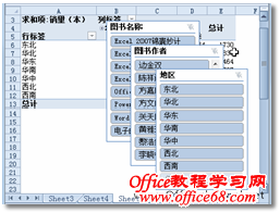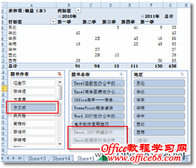 图4 筛选数据 此时,通过观察“图书名称”切片器,可以清晰地发现,有些图书名称已显示为了灰色,也就是说,作者“方文成”未曾参与这些图书的编写,这样的效果可以避免在执行下一步筛选操作时,选择错误的目标对象。 2. 如若想查看作者“方文成”参与编写的某本或某几本图书的销售情况,则可继续在“图书名称”切片器中单击选择目标图书(可以在按【Ctrl】键的同时,单击鼠标,以选择多个目标)。 选择好目标图书后,同样可以看到“地区”切片器中的变化,此时,只有3个地区“东北”、“华东”和“西南”未被显示为灰色,也就说明作者“方文成”参与编写的“Office高手——商务办公好帮手”和“电子邮件使用技巧”这两本图书只在这3个地区有销售订单,如图5所示。