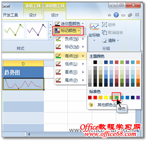 4. 为了让图表中的最高值和最低值可以更好的区别开来,可以通过更改“标记颜色”来达到目的。单击“样式”选项组中的【标记颜色】按钮,然后将鼠标指向“高点”选项,在颜色库中选择合适的颜色,如“绿色”,鼠标单击目标颜色,即可完成更改,如8所示。
