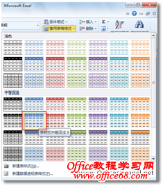 图1 套用表格格式 2. 在随即打开的内置表格“样式库”中,选择合适的样式并单击,如图2所示。