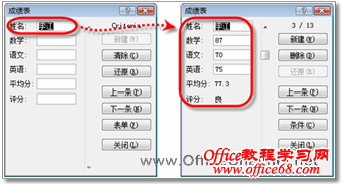 5)单击【条件】按钮,将自动清空记录,同时【条件】按钮变为【表单】按钮,此时用户输入某一条件,记录单将自动定位至包含该条件的记录,并显示记录的详细信息。例如,在“姓名”文本框中输入“李江”,按【Enter】键,“成绩表”记录单将显示“李江”所有成绩的详细信息,如图4所示。