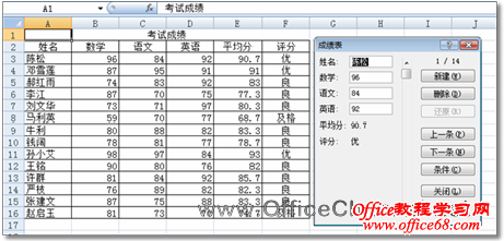 记录单是将一条记录分别存储在同一行的几个单元格中,在同一列中分别存储所有记录的相似信息段。使用记录单功能可以轻松地对工作表中的数据进行查看、查找、新建、删除等操作。下面就利用记录单的功能填写“考试成绩”表中的数据,其具体操作步骤如下。