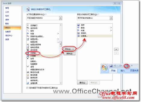 1)打开Excel工作簿,单击【Office按钮】,在随即打开的下拉菜单中单击【Excel选项】按钮,打开“Excel选项”对话框。单击左侧导航栏中的【自定义】按钮,在“从下列位置选择命令”下拉列表框中,选择“不在功能区中的命令”,在左侧列表框中选择“记录单”,然后单击【添加】按钮,将其添加到右侧列表框中,单击【确定】按钮关闭对话框,此时,【记录单】命令就被添加到快速访问工具栏中了,如图1所示。