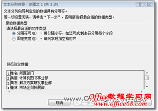 图2 单击【分列】按钮 (3)在随即打开的“文本分列向导 - 步骤之1(共3步)”对话框中,选中“分隔符号”单选按钮,如图3所示。