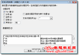 图6 文本分列 运用此方法对列中的文本进行拆分时,也可以在“文本分列向导 - 步骤之2(共3步)”对话框的“分隔符号”选项区域中,选择“其他”复选框,然后在其后的文本框中自定义分隔符号,分隔出您想要的信息,如图7所示。