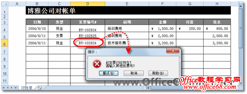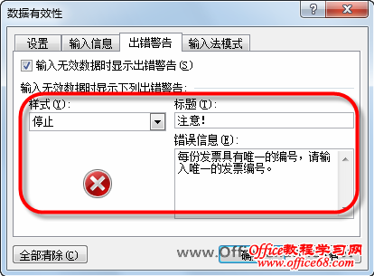 (4)单击【确定】按钮,完成对当前单元格的数据有效性设置。使用自动填充功能,将该单元格的数据有效性设置复制到该列中的其他数据单元格。此时,如果用户输入重复发票编号,则会弹出预先设置好的警告信息。
