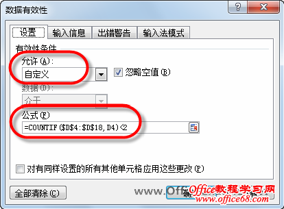 (2)在“数据有效性”对话框的“设置”选项卡中,将“允许”设置为“自定义”,在“公式”文本框中,输入一个用于判断当前单元格值是否在当前列中唯一的公式,此处为“=COUNTIF($D$4:$D$18,D4)<2”。 (3)切换到“出错警告”选项卡,在“样式”选项卡中选择“停止”,在“标题”和“错误信息”文本框中分别输入要通过弹出对话框显示给用户的信息标题和具体内容。