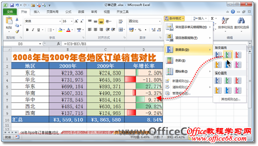 Excel 2010中,进一步增强了条件格式的功能,改善了数据条的绘制规则,通过一个坐标轴明显区分单元格中的正直和负值,让数据对比的可视化效果更佳。