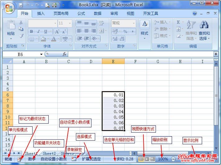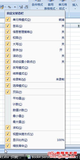 Excel状态栏位于程序窗口底部,它可以显示各种状态信息,如单元格模式、功能键的开关状态等,Excel 2007的状态栏所包含的信息比Excel 2003丰富得多,在其右侧还放置了视图切换、显示比例等快捷操作命令。在Excel中进行相关操作时,经常关注状态栏的信息非常是有用的。 在Excel 2007中,我们可以自定义状态栏,以确定需要显示哪些信息。方法是在状态栏上右击,然后在弹出的快捷菜单中进行选择。如果取消勾选,状态栏中将不显示相关信息。