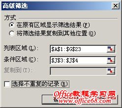 公式中第一行数据所在单元格(F2和G2)必须使用相对引用。然后进行高级筛选,条件区域为$J$3:$J$4。