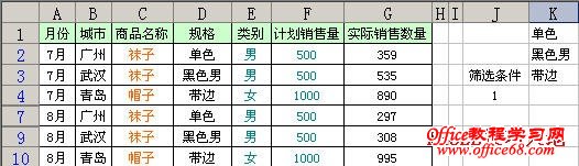 例如要筛选出“规格”为“单色”、“黑色男”和“带边”的数据,先在其他空白列中输入需要筛选的项目名称,如在K1:K3中分别输入“单色”、“黑色男”和“带边”,然后在J4单元格中输入公式: