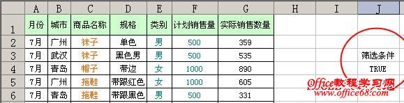 在Excel高级筛选中,可以将公式的计算结果作为条件使用。使用公式结果作为条件进行高级筛选时必须注意的是,要将条件标题保留为空,或者使用与数据区域中的列标题不同的标题。如下图的数据区域为A1:G23,条件区域在J3:J4中,其中条件区域中的标题“筛选条件”与数据区域中的任何一个列标题都不同。 1.筛选“计划销售量”大于“实际销售量”的数据: