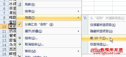 5.选择任一名称,鼠标右击,在弹出的快捷菜单中选择“筛选→前10个”。