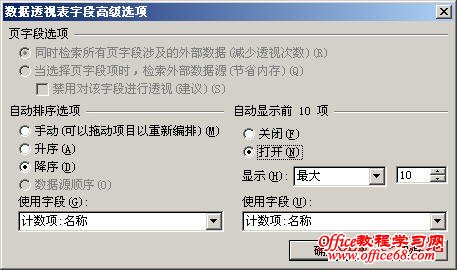 6.在弹出的“数据透视表字段高级选项”对话框中,将“自动排序选项”设置为“降序”,“使用字段”选择“计数项:名称”;将“自动显示前10项”设置为“打开”,单击“确定”,如图。