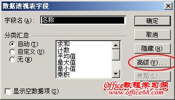 5.在弹出的“数据透视表字段”对话框中单击“高级”按钮。