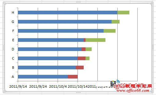 选择数据区域中的某个单元格,在功能区中选择“插入→条形图→堆积条形图”,在插入的图表中删除图例,然后在“图表工具-设计”选项卡中选择 “选择数据”,弹出“选择数据源”对话框,分别选择不需要的“天数”和“结束日期”系列,单击“删除”按钮删除这两个系列后确定,这时图表如下图: