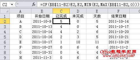 在数据区域原C列左侧插入两列,分别表示以B11单元格中日期为当前进度的各项目已完成和未完成的天数。如图所示,插入两空列后,在C2单元格中输入公式:=IF($B$11-B2>E2,E2,MIN(E2,MAX($B$11-B2,0)))向下填充公式至C9单元格,该公式获取已完成的天数。在D2中输入:=E2-C2向下填充至D9单元格,该公式获取未完成的天数。