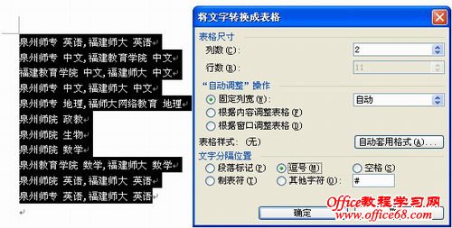 3、这样我们就得到了以逗号分开的数据,我再利用word里的文本转换为表格,以“文字分隔位置”选“逗号”,如图所示: