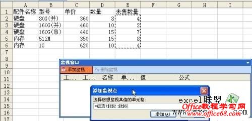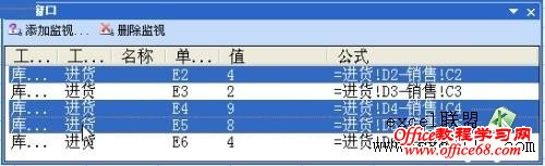1、单击菜单栏“视图”→工具栏→监视窗口,打开“监视窗口”对话框(如图1),单击“添加监视”按钮,使用鼠标在“进货”工作表中拖选中准备添加的单元格,最后点“添加”按钮。(如图2)