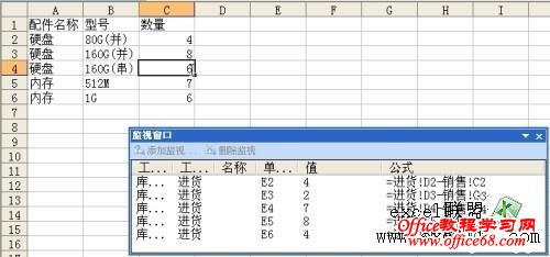 2、在“销售”工作表中输入或修改“数量”单元格中数据的同时,就能同时在“监视窗口”中看到“进货”工作表中“未售数量”单元格的数值变化了。(如图3)