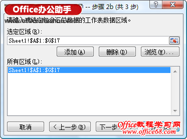 在弹出的对话框中再次单击“下一步”,弹出““数据透视表和数据透视图向导--步骤2b”,选择工作表中的A1:G17区域,单击“添加”按钮。