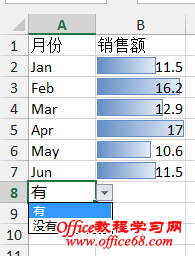 估计太多人和我一样,只关注了前面,却没关注后面红框的东西。或者因为有时点不点都没什么变化,久之就觉得这里打不打勾是一样的。当然数据条这里的勾是无效的。 但事实,这里的东西是有用的,现在我们用到了。 我们利用数据有效性来创建个有,没有的下拉。 我们的想法是当有时,数据条显示。没有时,就消失。所以我们把它们联动起来,继续创建条件格式,如图