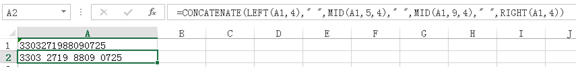 那就来分享一个关于银行卡号的应用吧。 比如银行卡号为3303271988090725。我们为了看的更清楚,我们需要每隔4位加个空格。3303 2719 8809 0725 效果就是如此。当然在excel源数据里,我们肯定不可能就1个这样的银行卡号。今天的案例来源于一个朋友做人事工作的,需要去检查各部门银行卡的消费情况,对照导出的花费记录。因为结果表是之前被人工加空格的,但导入的记录是没有的,所以需要去统一起来。 每隔4个加空格,也就是说我们要用mid来截取位数,还有连接函数加上空格。这是我们最容易想到的。