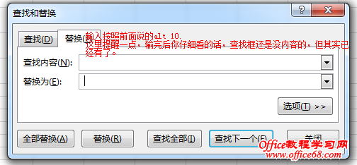 我们得到这些搜索,我点击了红框这个。然后看了下,提示查找替换中,查找按住alt,数字小键盘输入10,然后松开alt。替换处输入 空格。然后我就照做了,成功了。