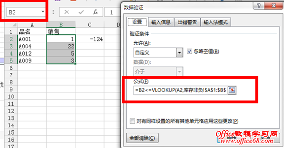=B2<=VLOOKUP(A2,库存非负!$A$1:$B$11,2,0)。可以这么理解,也就是当B2销量<=库存非负那表里对应的库存余额时,数据正常。否则就提示有错。