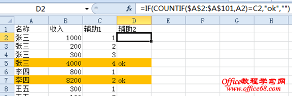 因为这数据既然是返回每个人的最后一行记录,所以数据一定是已经排好顺序了。那么最后的一行,这个第几行一定也就是等于张三的总行数。所以加辅助列2 D2==IF(COUNTIF($A$2:$A$101,A2)=C2,"ok","").