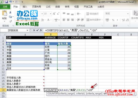 该函数解决了需要在多条件情况下进行计数的问题,扩展了COUNTIF函数的功能。例如:需要计算美国报名人数超过20人的城市数量。