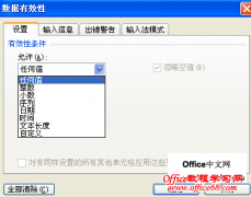 在excel2003中点击菜单栏的数据有效性,Excel显示数据有效性对话框。数据有效性对话框的设置选项卡使我们能够定义下列任何一种数据有效性标准,如图所示 ● 任何值 :选择该选项,删除任何存在的数据有效性。然而,要注意,如果输入消息选项卡上的复选框被选择,则输入信息(如果有的话)仍然显示。 ● 整数 :用户必须输入...
