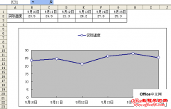 用户可以在图表中添加一条或多条水平线作为参照对象,表示平均值、公差范围或目标值等参照指标。下面以如图所示的温度图中添加水平线为例,介绍其绘制方法。 1.选取A1:G2单元格区域,利用图表向导制作折线图,如上图所示。因为数据列表中的第一行为日期,所以在图表的横坐标上自动生成时间刻度。 2.右键单击图表,在弹出的...