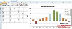 您可能会注意到,设置数据系列格式对话框中的填充选项卡中有一个渐变填充选项。该选项对数据系列使用了多种颜色。不幸的是,其中的颜色与数据系列值并没有联系。 本文介绍如何创建条形图,使其中每条柱子的颜色由显示的值确定。如图显示了这样一个图表(当彩色显示时会更醒目)。创建图表使用的数据在区域A1:F14中。 这个图...