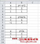 本文介绍在Excel 2007/2010中用散点图和趋势线绘制一次函数y=kx+b的图像的方法。以Excel 2010为例,在同一图表中同时绘制y=-x+2、y=4x+3和y=2x三个一次函数图像。 对每个一次函数,只需两个数据点即可。在工作表中输入这三个一次函数的两个数据点,在A列输入x值,在B列输入对应的y值,如图。 1.添加y=-x+2函数的数据:选择...