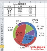 Excel中的饼图可以反映一组数据中各数据点所占百分比,如果要在同一饼图中显示两组数据,可以用双层饼图。本文介绍在Excel 2007/2010中制作双层饼图的方法。假如某服装公司2010年的销售数据如图,需要在一个图表中用饼图显示广州和武汉两地的销售数据。 以Excel 2010为例说明如下: 1.选择数据区域,本例为A2:C6,在功能区...