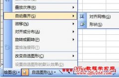 在Excel中移动形状或对象时,可以让形状或对象自动对齐到网格线。即当对象形状或移动到网格线附近时,能够自动地被吸附到网格线上。设置方法如下: 方法一: 按住Alt键,用鼠标移动某个形状或对象,可以使其精确地对齐到网格线。 方法二: Excel 2003: 在绘图工具栏中,单击绘图按钮,在弹出的菜单中选择自动靠齐对齐网格...