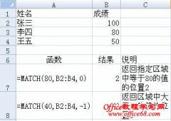 Excel2007的MATCH函数返回在指定方式下与指定数值匹配的数组中元素的相应位置。 如图所示,在B7中输入 =MATCH(80,B2:B4,0) Excel2007的MATCH函数返回学生成绩区域中成绩等于80的值的位置2 如图所示,在B8中输入 =MATCH(40,B2:B4,-1) Excel2007MATCH函数返回学生成绩区域中成绩大于40的值的位置3 Excel2007的MATCH函数的用...
