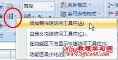 在Excel2007中,我们可以将经使常用的命令放入快速访问工具栏中,这样可以在使用中快速执行这些命令,避免在功能区选项卡中来回切换以节约时间。 1.添加功能区中的命令: 在功能区中右击一个常用的命令,如自动换行,合并后居中等,在弹出的快捷菜单中选择添加到快速访问工具栏即可。 对于合并后居中命令,在其右侧的下拉...