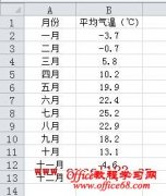 在Excel中制作条形图或柱形图时,默认所有的数据条(或柱形)都是同一种颜色的。有时会遇到数据为负值的情况,如果能在图表中用其他颜色表示负值将会更加醒目。在Excel 2010中,设置方法如下: 如图所示为某城市的月平均气温数据,需要用其制作一个条形图。 1.选择数据区域中的某个单元格,在功能区中选择插入选项卡,在图...