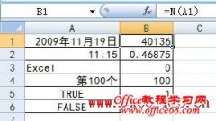在Excel工作表函数中,N函数可以将单元格中不是数值形式的值转换为数值形式。N函数的语法为: N(value) Value为要转化的值。 此外,N函数还可以将TRUE转换成1,将FALSE转换成0,将除错误值外的其他值转换为0。如下图: 下面是使用N函数的两个例子。 1.将日期转换为序列值,将时间转换为小数。 例如A1单元格中包含时间2009...