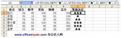 Excel中REPT函数的用法是按照给定的次数重复显示文本。我们本例使用REPT函数为成绩结果标明等级。 详见下图所示: 第一,选中G2单元格,在编辑栏输入公式:=IF(F2200,REPT(★,1),IF(F2300,REPT(★,2),REPT(★,3))),按下回车键,即可根据F2单元格中的分数,自动返回指定数目的★号。 第二,再向下复制公式,即可根据F列中...