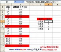 本文利用excel的rank函数来对不连续单元格进行排位(名次)。 实例详见下图,本表中统计了各个月份以及每季度的销售额,现在需要分别对4个季度进行销售额排名。 以下是使用excel的rank函数来对不连续单元格(4个季度),进行排位(名次)的操作步骤: 第一步,单击E7单元格,在编辑栏输入公式:=RANK(B5,($B$5,$B$9,$B$13,$B$1...