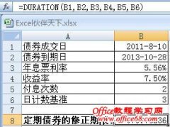 在Excel中,如果 计算定期债券的修正期限 ,可以使用DURATION函数计算定期债券的修正期限。Excel2007可使用DURATION函数计算定期债券的修正期限。 如上图所示,在B8单元格输入公式: =DURATION(B1,B2,B3,B4,B5,B6) 按回车键即可计算定期债券的修正期限。返回定期债券的修正期限。 Excel2007可使用DURATION函数计算定期债券...