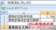 在Excel中,如果要根据债券的实际年利率和每年的复利期数 计算债券的名义利率 ,可以使用NOMINAL函数计算债券的名义利率。Excel2007可使用NOMINAL函数计算债券的名义利率。 如上图所示,在B4单元格输入公式: =NOMINAL(B1,B2) 按回车键即可计算债券的名义利率。返回债券的名义利率。 Excel2007可使用NOMINAL函数计算债券的...